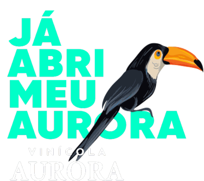 A vibrant toucan with a large beak sits next to the phrase "JÁ ABRI MEU AURORA" from Vinícola Aurora, promoting a drink.