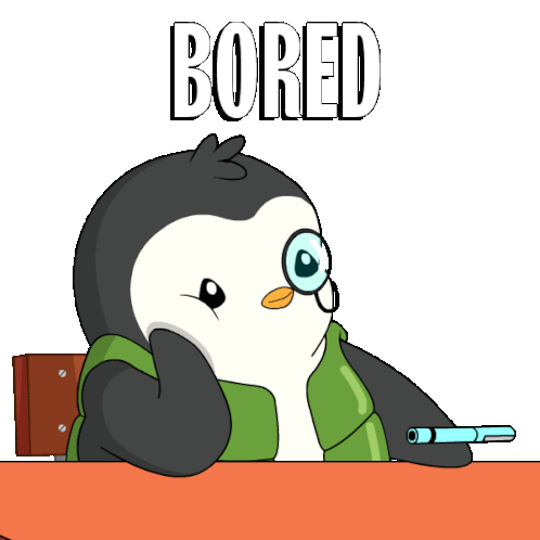 A cute cartoon penguin wearing a monocle and green vest sits at a desk, looking utterly bored with a pen nearby.