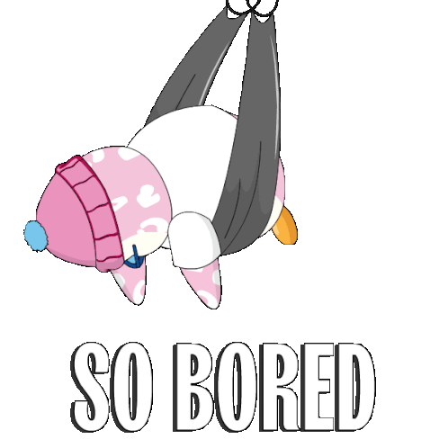 A cute cartoon penguin hangs upside down in a sling, wearing a pink hat and diaper, with 'SO BORED' text.