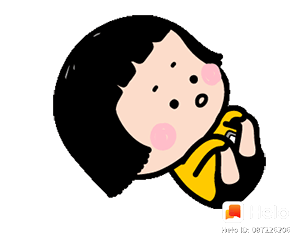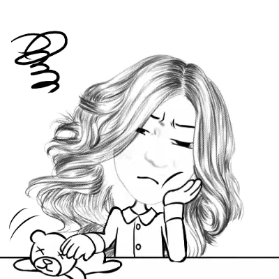A cute cartoon character with black hair and pink cheeks rests its head on its hand, looking bored or thoughtful.
