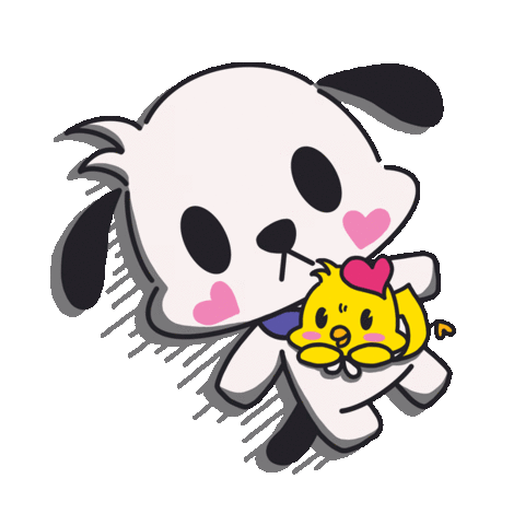 A cute, bored white dog character holds a small yellow chick, both looking tired or uninterested, conveying a tedious mood.