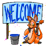 An orange Bori Neopet stands by a glittery 'WELCOME' sign, holding a brush next to a bucket.