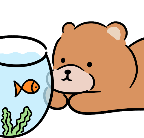 Kiro the bear calmly watches Kivi the goldfish swimming in its bowl, a moment of quiet curiosity.