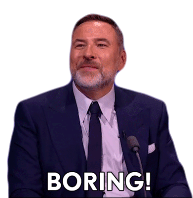 David Walliams from Britain's Got Talent exclaims 'Boring!' with a wide-open mouth, expressing disinterest or disapproval.