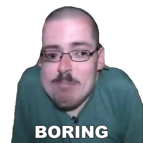 Ricky Berwick with a distorted face and the word 'BORING' expressing disinterest or boredom.