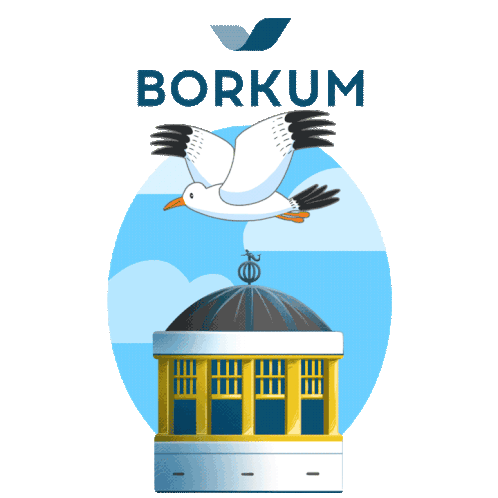 An animated sticker featuring a seagull flying over the iconic Musikpavillon on the German North Sea island of Borkum.