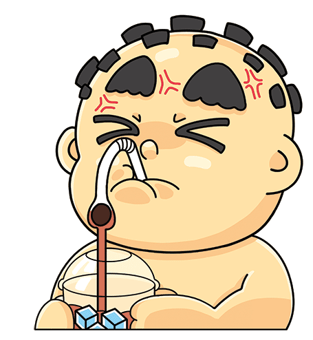 The bald 'Botak' character struggles to drink boba tea through a straw, expressing frustration and then surprise.