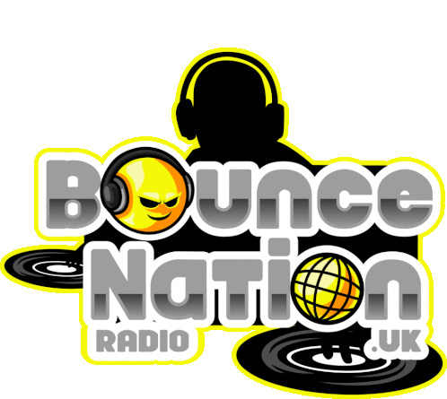 a logo for bounce nation radio uk with a dj wearing headphones and a smiley face