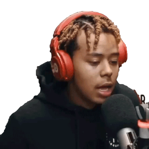 Ybn Cordae in a black hoodie and red headphones, rhythmically moving his head while rapping into a microphone, jamming to music.