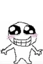 A pixelated white cartoon character, Bouncy Silly Guy, with huge eyes, rosy cheeks, and a wide, toothy grin.