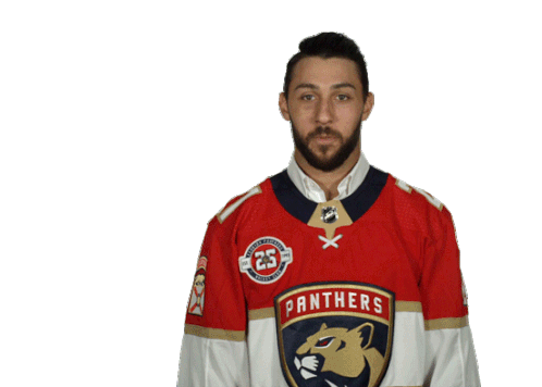 Vincent Trocheck, a hockey player in a red Florida Panthers jersey, bows with hands together.