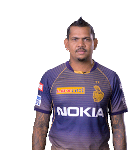 Sunil Narine, the KKR cricketer, shows respect with a prayer-like bow gesture in his team jersey.