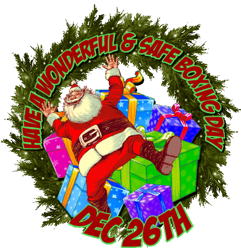 Jolly Santa Claus tumbles on a pile of colorful gifts, wishing everyone a wonderful and safe Boxing Day on December 26th.