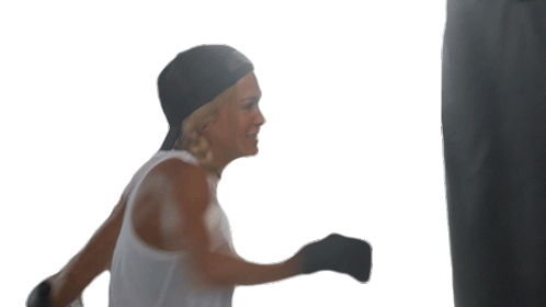 Carrie Underwood intensely punching a boxing bag during a workout, showcasing her strength and dedication.