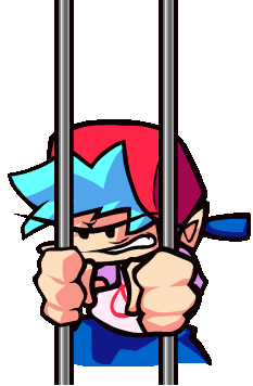 Boyfriend FNF, the iconic character, is seen trapped behind prison bars with an angry expression.