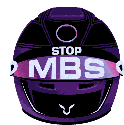 A purple racing helmet with a shimmering 'STOP MBS' visor, protesting Mohammad Bin Salman and remembering Jamal Kashoggi.