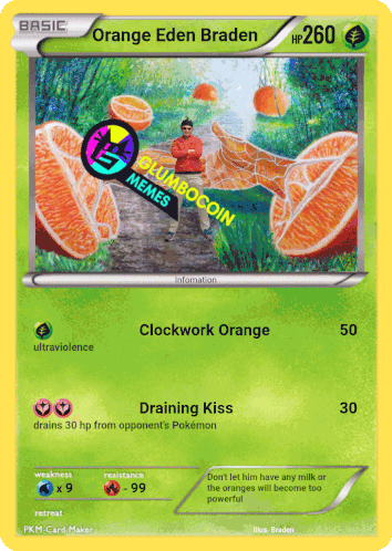 An animated Pokémon-style trading card featuring Braden, also known as Orange Eden Braden, with Glumbocoin memes.