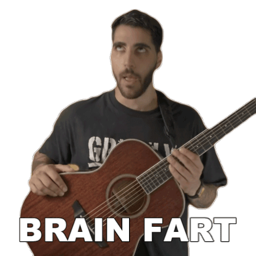 Rudy Ayoub, holding an acoustic guitar, looks up in thought with 'BRAIN FART' text, expressing a momentary mental block.