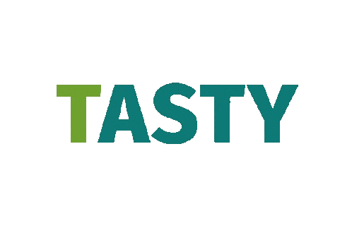 A vibrant animated sticker featuring the 'TASTY' brand logo in teal and green on a clean white background.