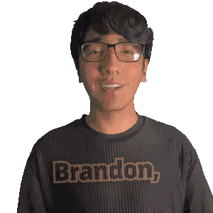 a man wearing glasses and a brandon t-shirt blows a kiss