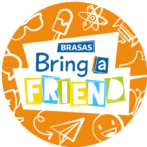 Animated sticker for BRASAS English Course, featuring two designs: 'Bring a Friend' and 'I Love My Friends', celebrating friendship.