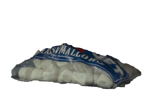 A bag of marshmallows, labeled 'MARSHMALLOWS', is shown with Mini Pufts characters appearing to break free from inside.