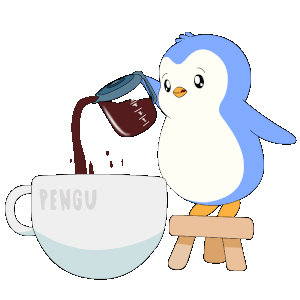 Pengu, the adorable penguin, stands on a stool and pours fresh coffee into a cup labeled 'PENGU'.