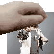 A hand gently 'petpets' a figurine of Brian David Gilbert, also known as Bdg, dressed as Professor Avery Goodman.