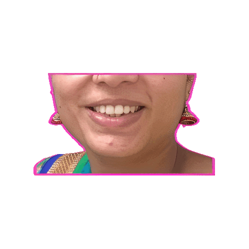 A woman's bright smile with pink lips and white teeth, featuring traditional jhumka earrings and a pink border.