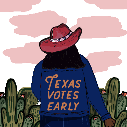 Brittdoesdesign's animated sticker shows a person in a cowboy hat with 'Texas Votes Early' on their jacket, surrounded by cacti.