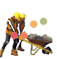 A pixelated, broken GIF style animation of two construction workers pushing a wheelbarrow with loading circles.