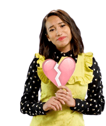 Sydney Park, in a yellow dress, smiles while holding a pink broken heart symbol, expressing a bittersweet emotion.