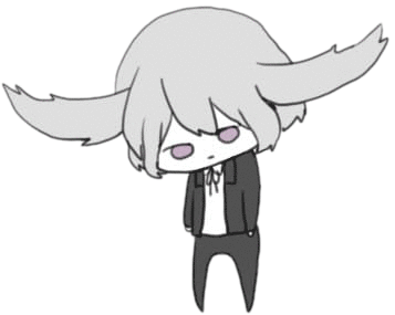 A chibi-style animated character with light grey hair and purple eyes, looking unimpressed and slightly brooding.
