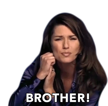 Shania Twain with a pleading expression, clasping hands and exclaiming 'BROTHER!' in a reaction sticker.