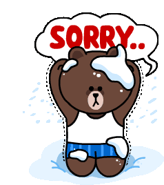 A cute brown bear, resembling LINE Friends' Brown, stands in snow with a speech bubble saying "Sorry..".