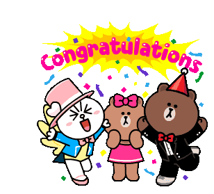 Brown, Cony, and a friend celebrate with a pink striped gift box, perfect for congratulations.