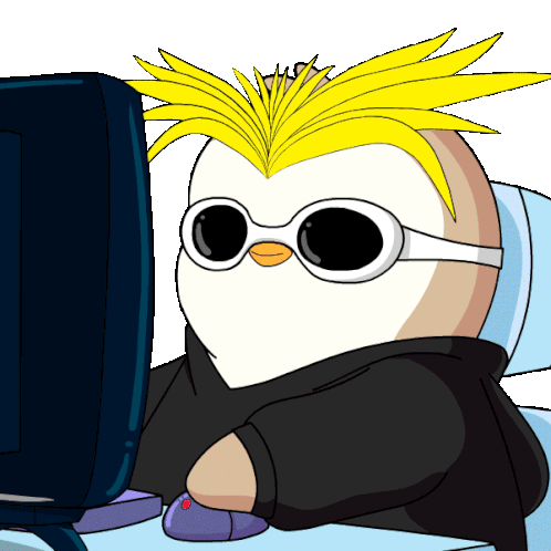 A cool Pudgy Penguin with a mohawk and sunglasses browses Unstoppable Domains on a computer, giving a thumbs up.