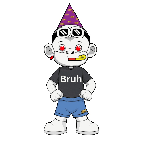 a cartoon character is wearing a party hat and sunglasses and a shirt that says bruh