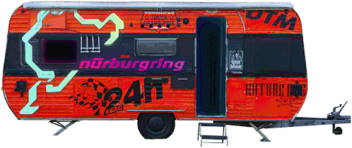 Animated sticker featuring a detailed orange and black Brünni Nürburgring camper van with racing decals.