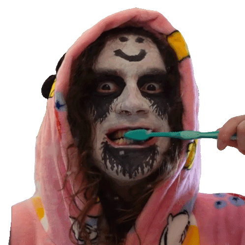 Bradley Hall, wearing face paint and a pink robe, brushes his teeth with a green toothbrush, showing a wide-eyed expression.