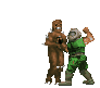 Doomguy in green armor brutally fighting a zombie-like demon in pixel art style.