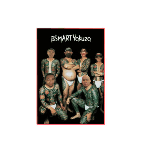 A group of BSMART Yakuza men, adorned with intricate traditional Japanese tattoos, pose for a striking photo.