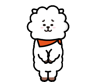 BT21 character RJ, a fluffy white alpaca, bows deeply with a red scarf, showing respect or gratitude.
