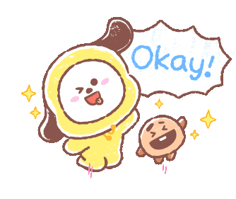 BT21's Chimmy, in a yellow outfit, happily jumps alongside Shooky, with a speech bubble exclaiming 'Okay!' and sparkling effects.