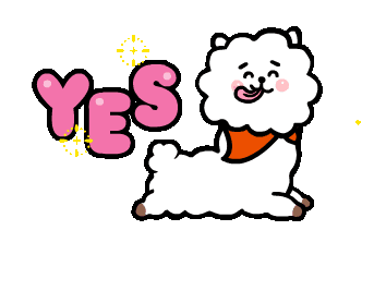 BT21 character RJ expresses enthusiastic agreement, happily hopping with its tongue out next to a big 'YES'.
