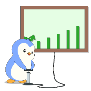 A cute Pudgy Penguin pumps up a Bitcoin (BTC) chart, showing a bullish market trend with a green arrow.