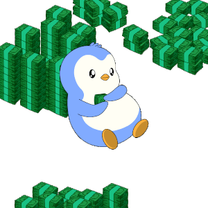 A cute Pudgy Penguin character sits surrounded by stacks of green money, happily playing with Bitcoin-themed cash.