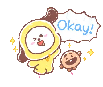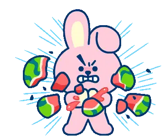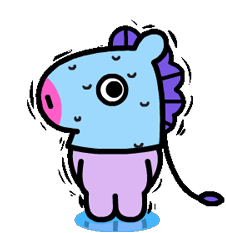 BTS BT21 character Mang appears nervous and sweaty, with drops of sweat visible on its light blue body and face. A cute animated sticker.