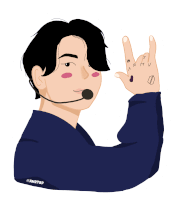An animated sticker of a BTS idol with black hair, wearing a microphone headset, making a rock on hand gesture.