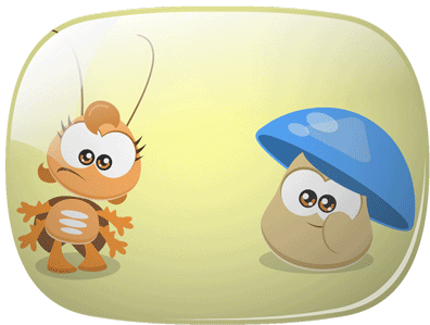 A cartoon cockroach watches in surprise as a mushroom blows a large pink bubblegum bubble that floats away.